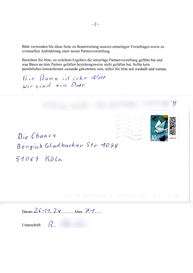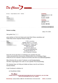 ![]() ![]() DankschreibenNichts ist schöner, Am Anfang telefonieren beide nur miteinander. Einmal - mehrmals. Irgendwann. Manchmal etwas früher - manchmal etwas später - ist es Fühlen Sie mit und lesen Sie eine kleine Auswahl von Schreiben unserer Vielleicht können auch Sie uns bald Ähnliches schreiben ... >> zurück zum Anfang | Galerieauswahl 1-2 Weitere Schreiben können Sie gerne in Die Chance - Partnerglück | Themenübersicht:
